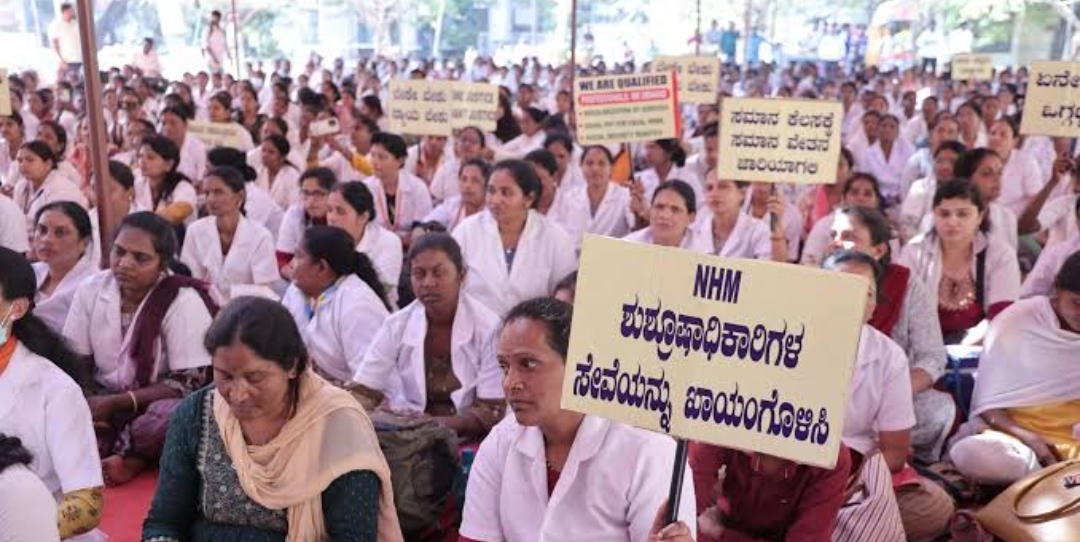 ಬೆಂಗಳೂರು : ರಾಷ್ಟ್ರೀಯ ಆರೋಗ್ಯ ಅಭಿಯಾನ ಅಡಿಯಲ್ಲಿ ಸೇವೆ ಸಲ್ಲಿಸುತ್ತಿರುವ ಶುಶ್ರೂಷಾಧಿಕಾರಿಗಳ ಸೇವೆ ಕಾಯಂಗೊಳಿಸುವುದೂ ಸೇರಿದಂತೆ ವಿವಿಧ ಬೇಡಿಕೆ ಈಡೇರಿಕೆಗೆ ಒತ್ತಾಯಿಸಿ ಬೆಂಗಳೂರು ರಿನ ಫ್ರೀಡಂ ಪಾರ್ಕ್ ನಲ್ಲಿ ಕರ್ನಾಟಕ ರಾಜ್ಯ ಗುತ್ತಿಗೆ ಶುಶ್ರೂಷಾಧಿಕಾರಿಗಳ ನೌಕರರ ಕ್ಷೇಮಾಭಿವೃದ್ಧಿ ಸಂಘದ ಕಾರ್ಯಕರ್ತರು ನಡೆಸುತ್ತಿರುವ ಅನಿರ್ದಿಷ್ಟಾವಧಿ ಪ್ರತಿಭಟನೆಯು ಶುಕ್ರವಾರ 5ನೇ ದಿನಕ್ಕೆ ಕಾಲಿಟ್ಟಿದೆ.
